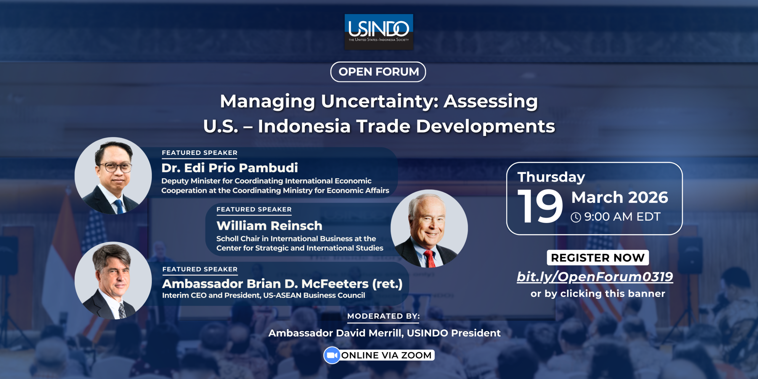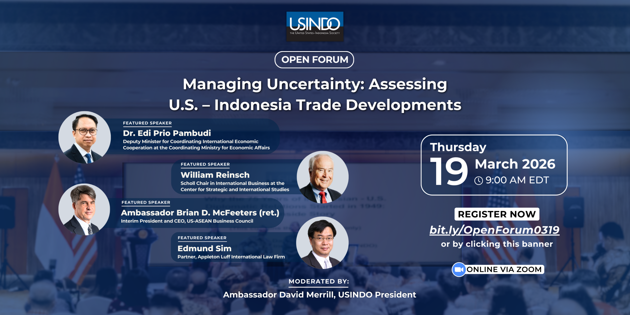 Open Forum Managing Uncertainty: Assessing U.S. – Indonesia Trade Developments Thursday, March 19th 9:00 a.m. EDT 8:00 p.m. WIB Online via Zoom Dr. Edi Prio Pambudi Deputy Minister for…