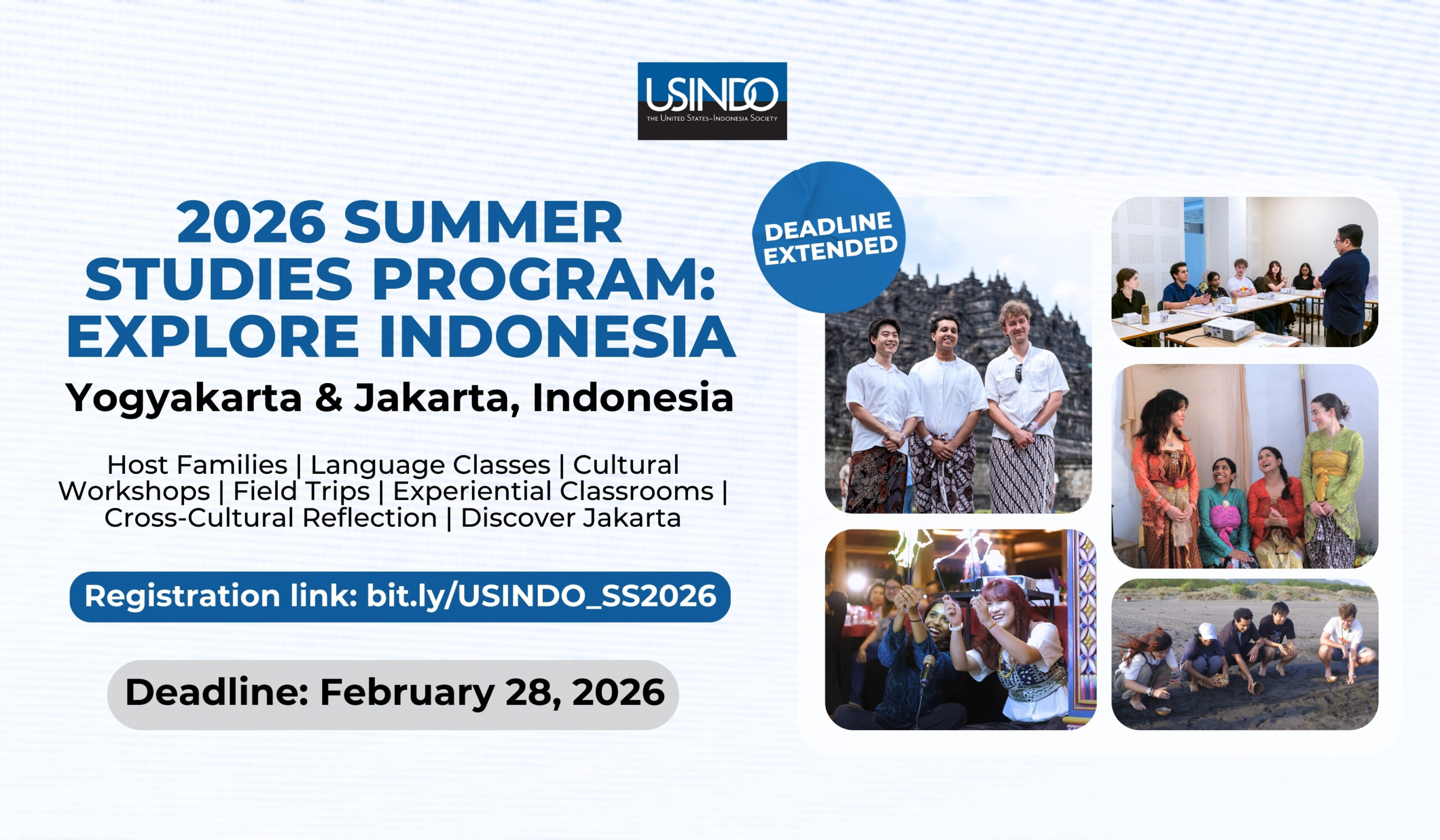 USINDO SUMMER STUDIES: EXPLORE INDONESIA Language, Culture, and Contemporary Indonesia An intensive 10-week language & culture studies fellowship held in Yogyakarta, Indonesia for U.S. university students and recent graduates. 260 alumni since 1996 Field Trips A series of field trips to celebrate cultural and historical sites as well as local organizations in Yogyakarta and Jakarta Cultural WorkshopsImmerse yourself in the unique culture of Indonesia Experiential ClassroomExperience candid interaction with Indonesians outside of your classroom setting, while also exploring current issues in the community Host Families Foster meaningful bonds with your Indonesian host families Cross-Cultural ReflectionReflect upon your experiences to navigate the cultural differences and similarities in Indonesia Jakarta Post-Program Engage with Indonesian government officials, NGOs, business leaders and experience its city tour Summer Studies Program Overview Eligibility Application Logistics Past Fellows Testimonials Student’s Blog Photo & Video Gallery Past Fellows 2025 Fellows Read More > 2024 Fellows Read More > 2023 Fellows Read More > 2019 Fellows Read More > 2018 Fellows Read More > 2017 Fellows Read More > 1 2 3 … 5 Next »